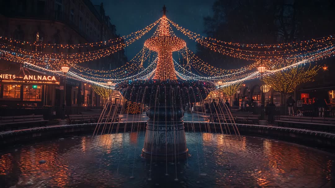- Illuminated Fountain with Festive Lights in City Plaza at Night