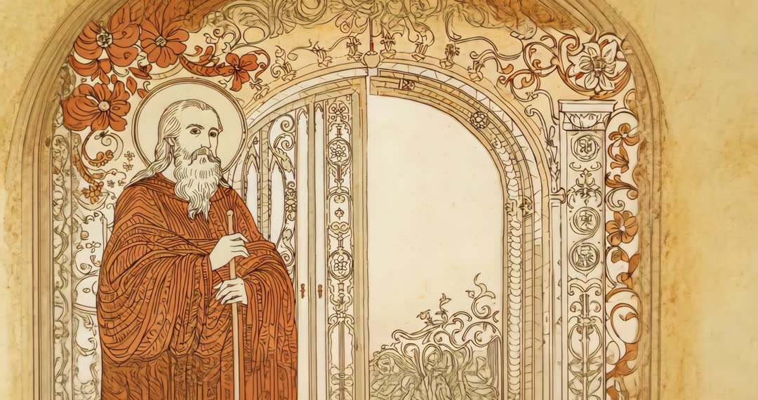 - Illuminated Manuscript depicting Saint with Staff in Ornate Archway