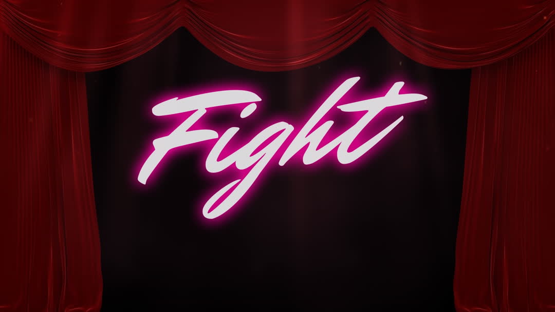 Dramatic word 'Fight' styled in bright neon against velvet red curtains and dark background. Represents power, strength, entertainment, and dramatic tension, ideal for theater promotions, drama-inspired projects, or communication concepts. Effective for attracting attention on social media headers and posters.