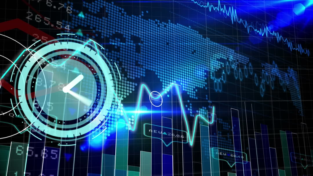 Image illustrates a concept of global economies and markets with a vibrant world map overlaid with stock charts and a digital clock animation. Ideal for websites and presentations related to business analytics, international finance, technological influence on markets, economic forecasts, and time-sensitive trading.