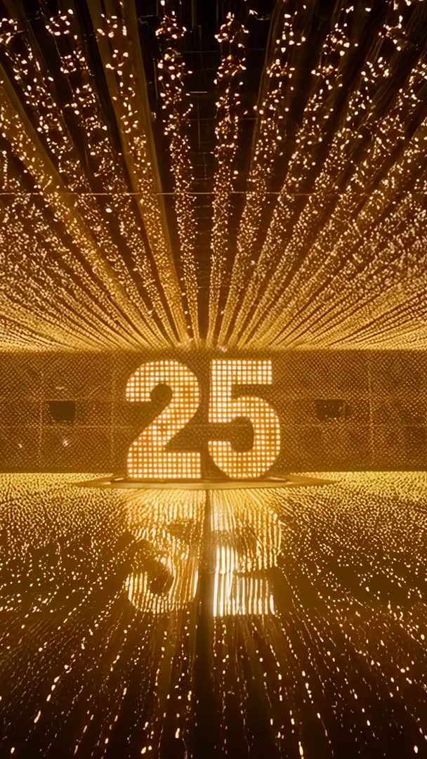 AI Generated Video. Golden LED numerals 25 glowing amid immersive mirrored light installation, ceiling strings of warm LEDs cascading toward reflective floor and amplifying glittering pattern. Symmetrical composition and vertical orientation creating dramatic depth and strong visual rhythm. Shifting LED pulses producing gentle flicker and dynamic reflection ideal for motion edits and looping background. Serving as bold intro or centerpiece for 25th anniversary campaigns, corporate milestone announcements, event countdown sequences, party promos, stage visuals, digital signage and social media reels. Use slow pan or steady hold to emphasize numeral reflection, apply color grading to enhance warm tone, overlay text or logo for branding, combine with ambient soundscape for immersive experience. Vertical 9:16 aspect ratio suiting reels, stories, mobile ads and on-screen stage projection; suitable for commercial licensing, broadcast and promotional content.