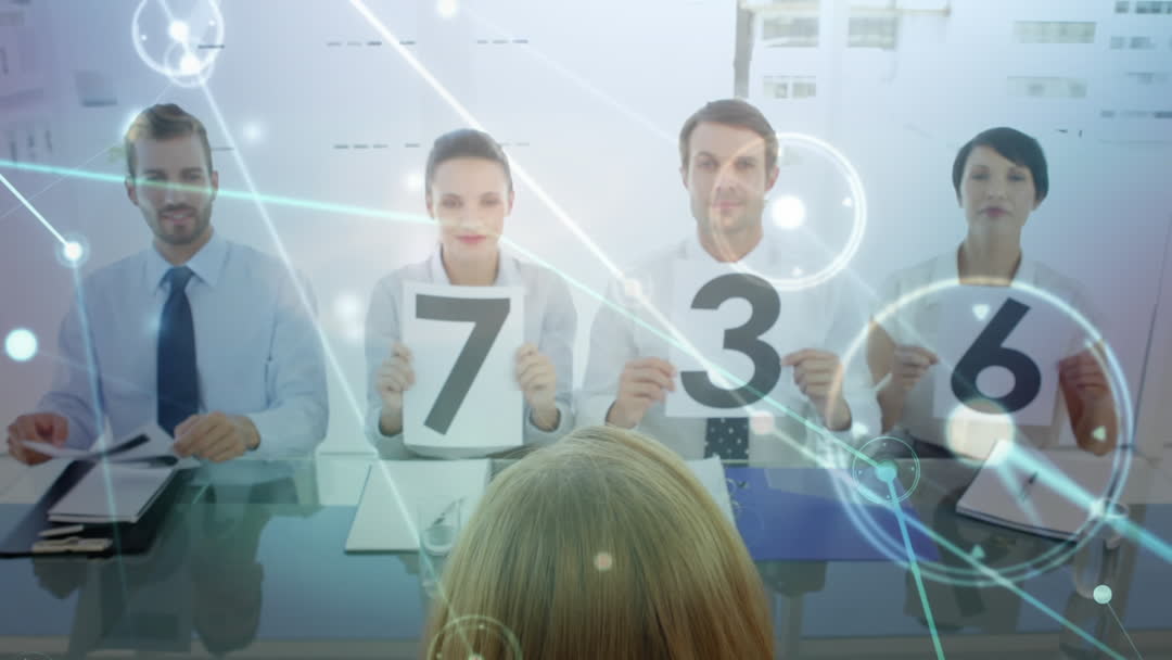 This video features four business people holding cards with numbers, creating an idea of an evaluative panel. An arcade-style background with digital connections and numbers adds a modern technological overlay. Perfect for projects on innovation, teamwork assessment, creative presentations, or showcasing concepts of modern business practices. Useful in illustrating concepts of data evaluation and team-based scoring mechanisms in marketing or branding materials.