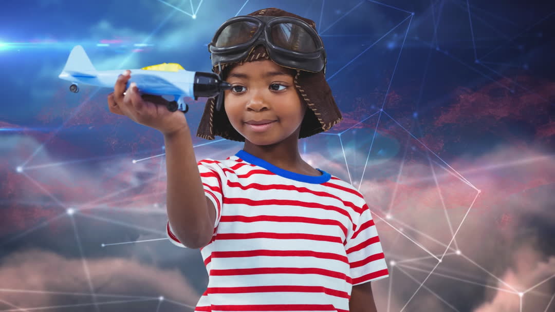 Young African-American boy wears pilot goggles holding toy airplane against digital background and clouds, symbolizing exploration and dreams. Ideal for educational materials on imaginative play, childhood creativity, and innovative learning.