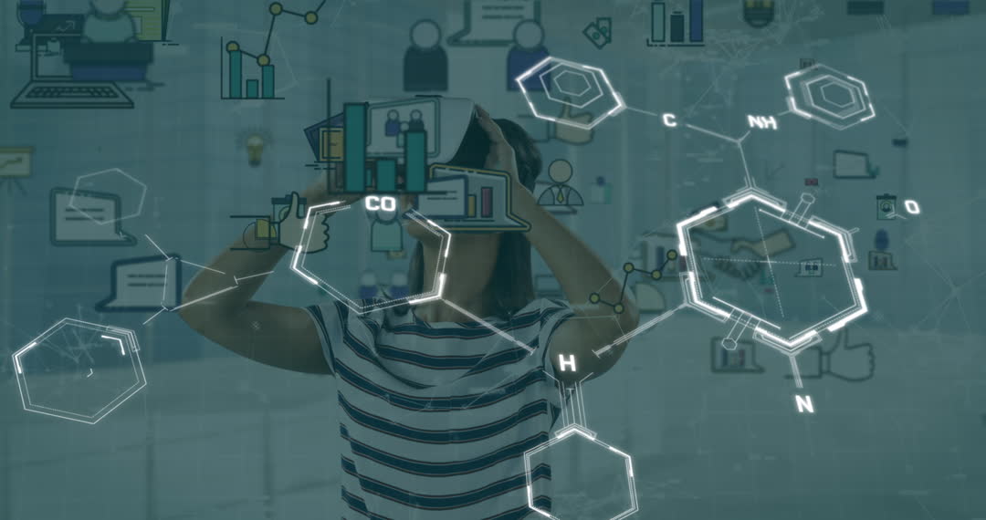 Woman engaging with virtual reality headset experiencing an overlay of digital visuals representing business icons and chemical structures, symbolizing the integration of modern technology in professional environments. Useful for illustrating the future of virtual reality in corporate settings, digital transformation, and innovation in technology-driven solutions.