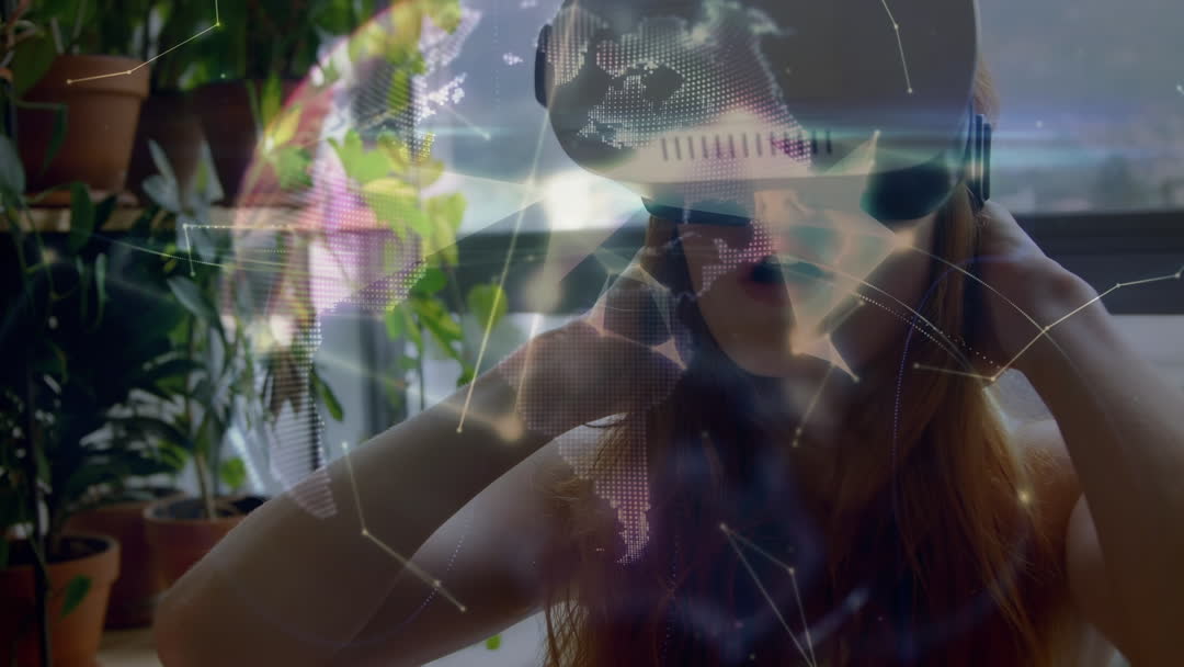 Young woman engages with a virtual reality headset in a cutting-edge tech environment. Visualization of networks and digital connections enhances the modern and futuristic theme, illustrating global connectivity and innovative experiences. Ideal for use in presentations, articles, or advertisements related to virtual reality technology, innovation, and global connectivity solutions.