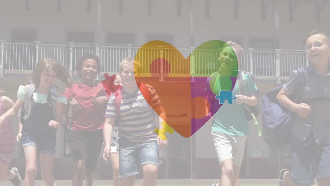 Animation showing diverse schoolchildren joyfully running together with a puzzle heart symbolizing autism awareness and unity. Ideal for educational resources, autism awareness campaigns, or celebratory events promoting friendship and inclusivity among children.