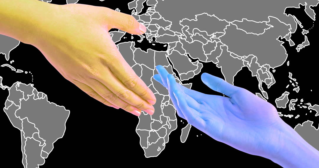 Illustration of two differently colored hands reaching out for a handshake above a stylized world map symbolizes global digital connections and communication. The contrasting colors of the hands suggest inclusion and unity achieved through technology. Ideal for themes related to international collaboration, networking in the digital world, or promoting diversity in the virtual space.