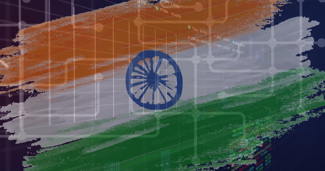 Overlay of Indian flag with abstract financial data and cryptocurrency themes signifies the country's growing involvement in global digital markets. Useful to illustrate economic growth, business opportunities in India, investment strategies, or blockchain technology implementations within the Indian context.