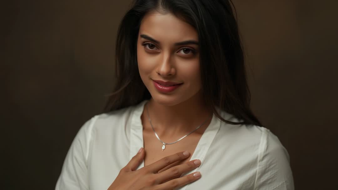 AI Generated Video. Video clip showing Indian woman placing hand over chest while lifting gaze toward camera, wearing delicate pendant necklace and white blouse. Soft warm lighting highlighting skin tones, shallow depth of field separating subject from brown backdrop, gentle smile and calm expression conveying confidence and sincerity. Close-up headshot composition featuring subtle catchlight in eyes, smooth skin tones, natural makeup and refined jewelry detail. Suiting jewelry commercials, wellness and mindfulness content, testimonial sequences, branding videos celebrating elegance and trust, editorial beauty features, social media profile reels, dating app intros and corporate diversity campaigns. Suiting thumbnail or opening shot for short films, product promos and lifestyle storytelling. Providing high-resolution clip for retouching and color grading, offering crop options for vertical social formats.