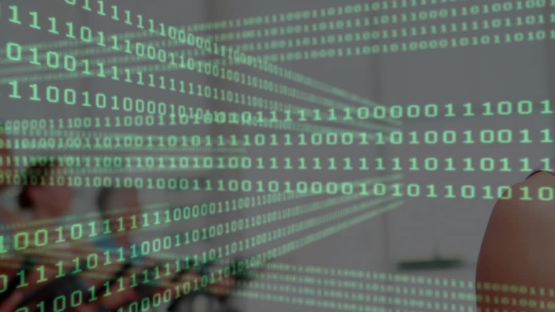 Showing indoor cycling class with participants pedaling on stationary bikes while translucent green binary code streams across frame, creating digital analytics overlay. Blending fitness action with data visualization to suggest wearable tracking, performance metrics, heart rate monitoring. Suiting fitness technology promotions, gym marketing campaigns, workout apps, wearable device demonstrations, data-driven health articles. Working well as video clip for website hero banners, social media ads, training analytics explainers, conference presentations, background for tech-fitness hybrid stories. Offering room for text overlay or lower-third graphics with central negative space and blurred background figures to support headlines or call-to-action messages.