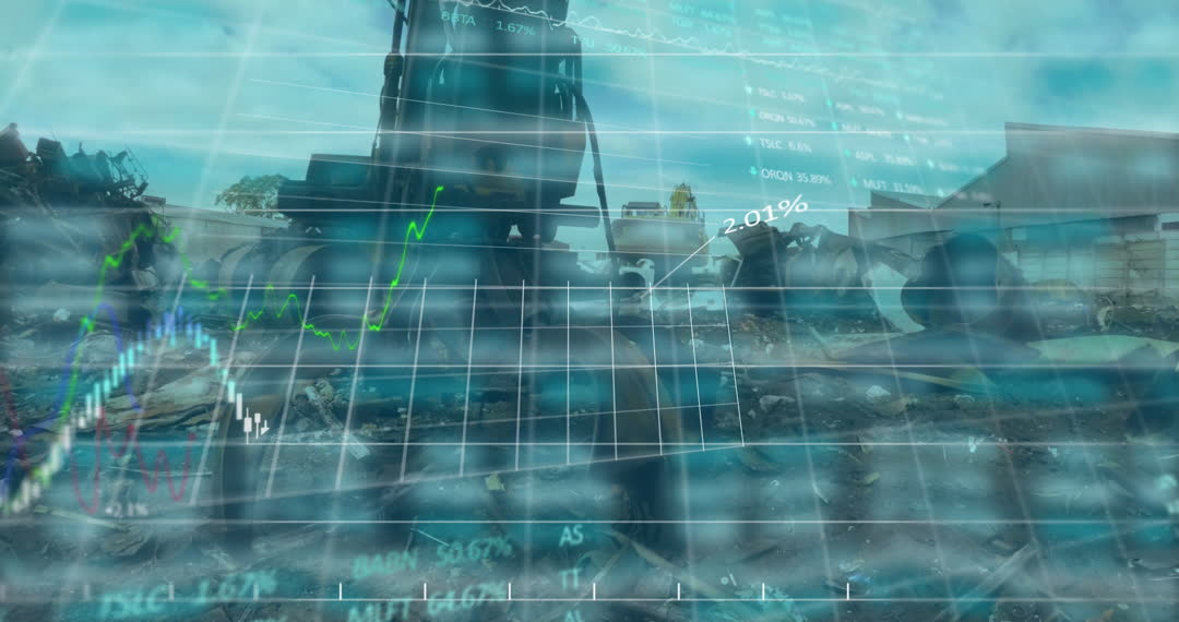 Composite visual features heavy industry machinery in junkyard with stock market data overlaying video. Evokes themes of economic recovery, market analysis, sustainable growth, and intersection of finance and industry. Useful for content on industrial economics, stock trading analysis, and financial reports emphasizing growth amid grounded industry context.