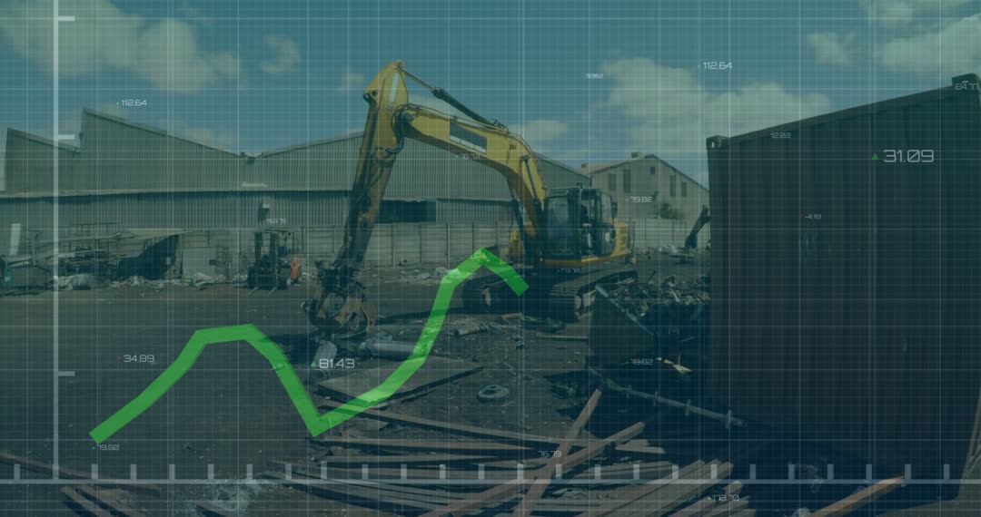An excavator situated at an industrial site is overlaid by a digital graph depicting financial data, illustrating themes of economic growth and development. This visualization emphasizes modernization and progress in urban construction settings. Useful for presentations involving industry advancements, economic trends, or data analytics relevant to the building and construction sectors.