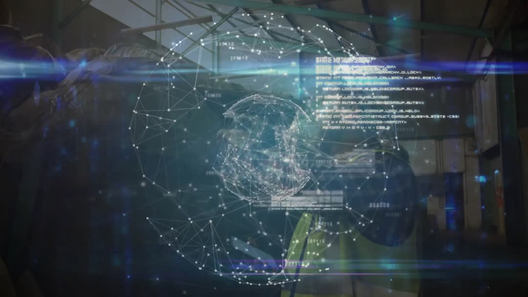A worker in an industrial setting uses a tablet, overlaid with a wireframe sphere and digital code. This suggests an integration of technology and industry, representing cybersecurity, technological innovation, and modern engineering. Suitable for use in articles, blog posts, or advertisements focusing on smart factories, digital transformation, engineering advancements, or next-generation industrial solutions.