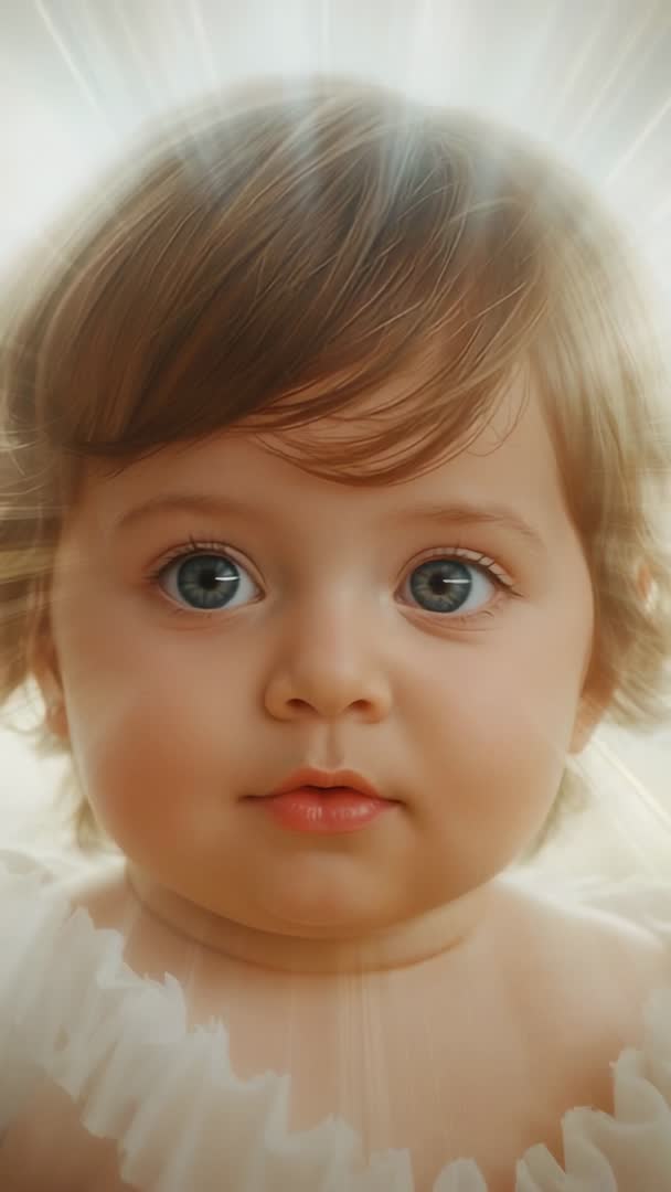 AI Generated Image. Closeup vertical footage showing infant blinking and gazing into radiant halo backlight, creating soft luminous glow around head. Soft studio lighting and ruffled white collar adding delicate, angelic mood. Footage capturing tender expression and direct eye contact, evoking innocence and wonder. Suitable for baby product commercials, parenting and family lifestyle videos, birth announcements, greeting cards, healthcare and pediatric campaigns, religious or spiritual projects. Editors finding easy room for color grading and slow-motion cutaways to extend emotional impact. Suggested uses include opening shot for family film, overlay for inspirational social media reels, hero clip for newborn clothing brands, b-roll for parenting articles, and educational content about early childhood development.