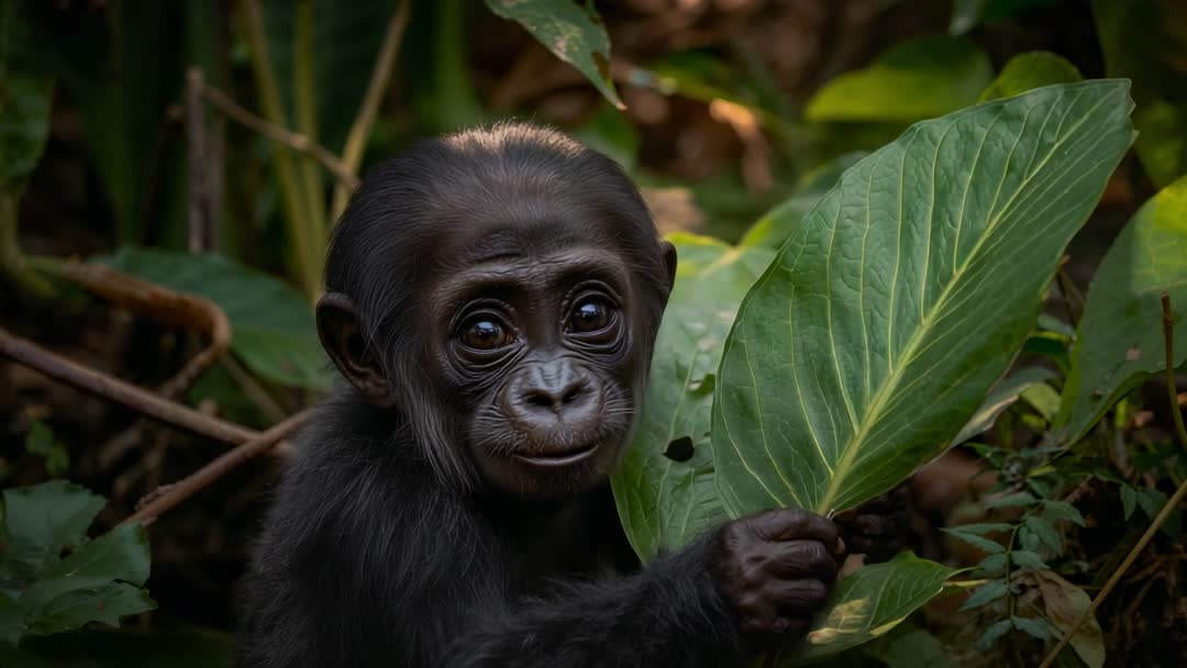 AI Generated Image. Close-up video showing infant gorilla peering through rainforest understorey while holding large leaf. Wide-eyed gaze conveying curiosity and gentle vulnerability. Shallow depth of field and dappled natural light creating intimate, cinematic mood. Slow framing highlighting facial features and small hand grasping leaf. Useful for wildlife documentary B-roll, conservation campaign videos, educational content about primate behavior and rainforest ecology, zoo promotional materials, children's nature programming, social media storytelling, NGO fundraising campaigns, editorial features on endangered species. Recommended post-production: gentle warm color grade, subtle film grain, layered ambient rainforest sound and distant bird calls to enhance atmosphere.