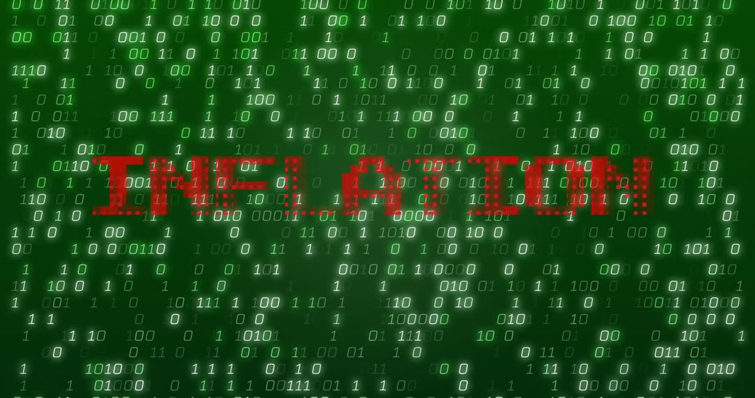 Red text reading 'INFLATION' shows within binary code, symbolizing economic inflation in digital data context. Useful for technology-related articles, financial forecasts, or educational content explaining economic concepts within limitations of digital frameworks.