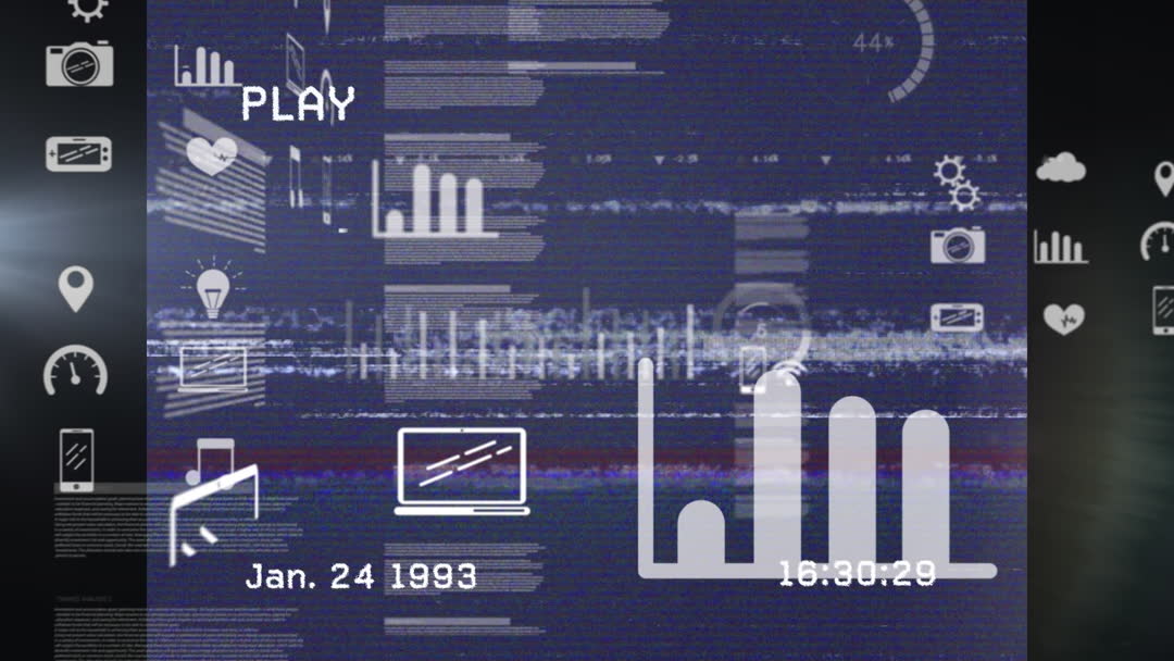 Digitally generated animation displaying a futuristic interface with icons and charts represents the concept of processing immense amounts of digital data. Ideal for illustrating topics related to advanced data technology and global business operations. Useful for presentations, websites, or videos focusing on digital transformation and analytics.