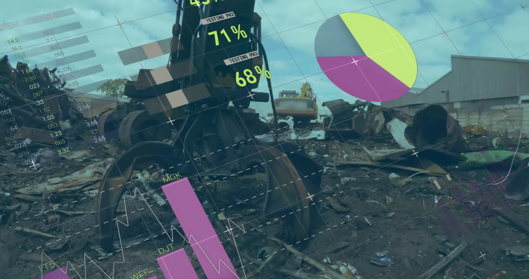 Visual showcases integration of data technology with recycling industry as infographic overlay features on scrapyard scene. Use in environmental technology presentations, recycling process analysis, or industry finance reports.