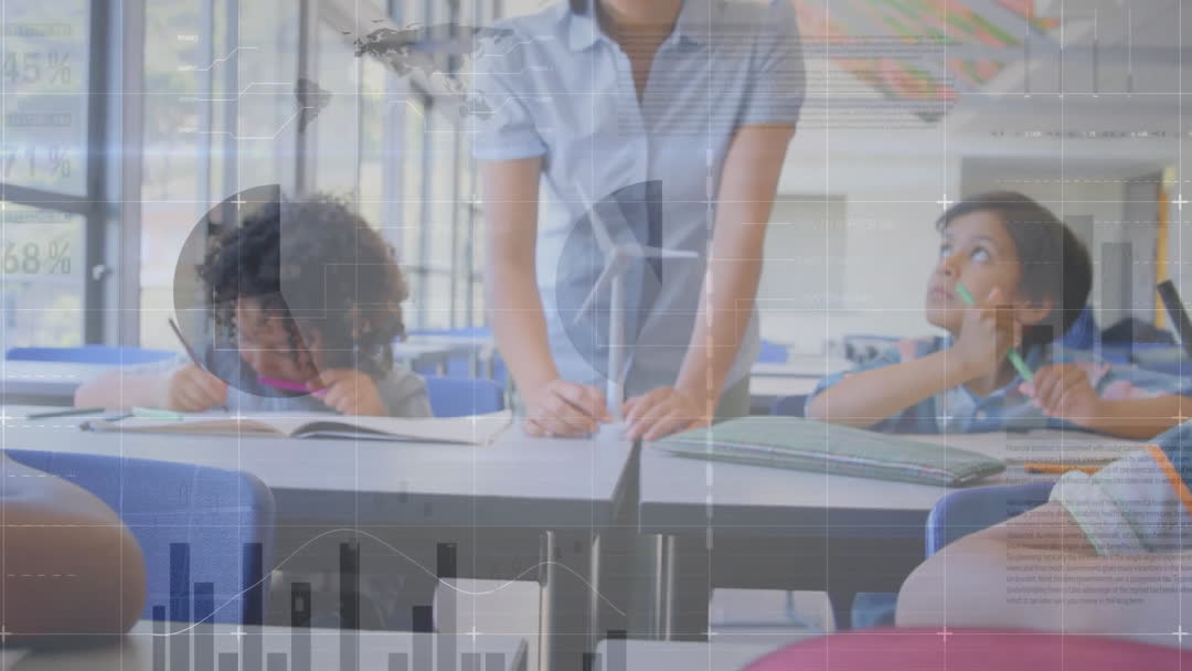 Infographic Interface Overlay on Teacher with Classroom Students Video