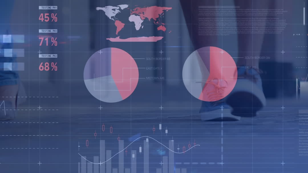 The video creatively blends an animation of an infographic interface overlaying women walking with shopping bags on the street. The interface displays global maps and data graphs, indicating concepts related to business, consumer trends, and progress. Bright, dynamic, data-driven visuals make this suitable for business newsletters, digital marketing content, and presentations focusing on growth, analytics, and economic insights.