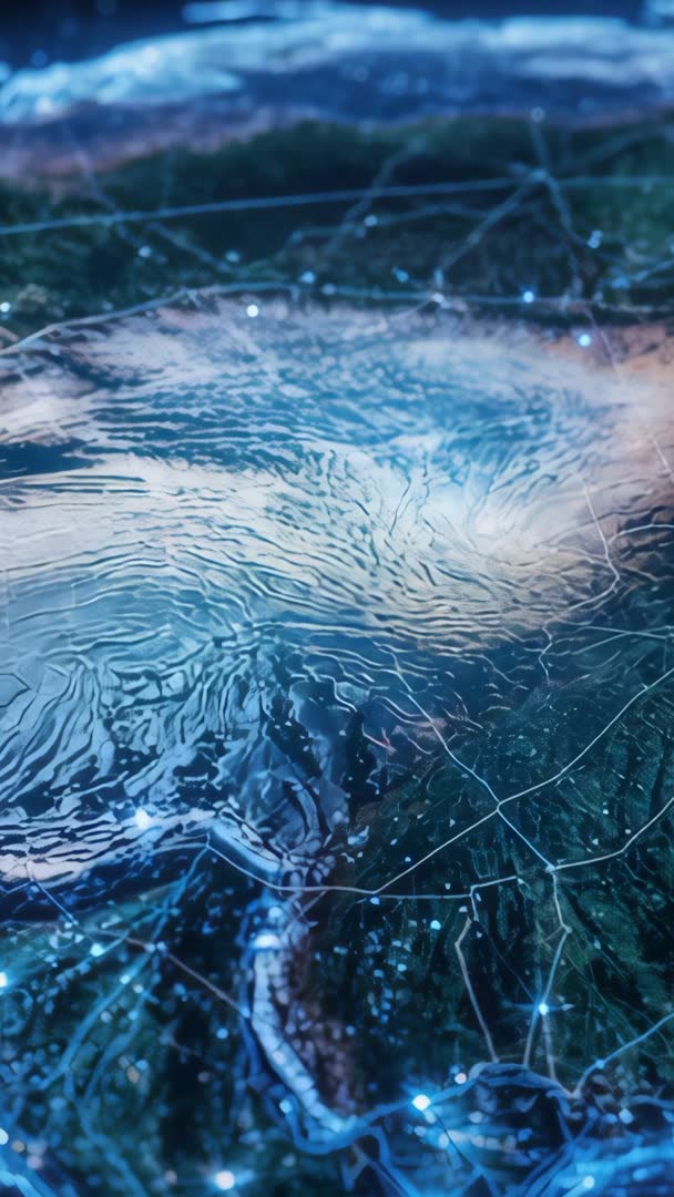 AI Generated Image. High-tech vertical loop showing data nodes initializing and lighting up terrain mesh across glowing digital landscape. Blue neon palette and pulsing particle points tracing network flow along mesh grid and circuitry lines, creating immersive depth and motion. Close-up layers and soft bokeh revealing 3D topology and connectivity pathways. Suiting tech presentations, powering app intros, supporting social reels, enhancing mobile ads, anchoring website hero sections, fueling broadcast bumpers, illustrating data visualization demos, amplifying AI or IoT campaigns, accenting cybersecurity reports, enriching motion graphics projects, looping in VJ sets. Working well as background for text overlays, title cards, UI mockups, or tempo-synced music visuals. Vertical 9:16 aspect, loopable footage, high-resolution, color-grade optimized for blue neon tones, friendly for mobile-first distribution and motion design workflows.
