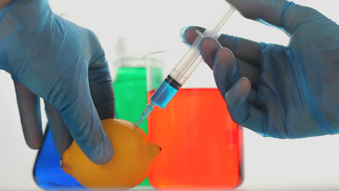 Gloved hands holding a lemon while injecting it with a syringe filled with blue liquid against a screen with colorful chemical solutions in beakers. Ideal for illustrating concepts of genetic modification, chemical testing, and laboratory procedures. This visual is useful for topics around scientific research, laboratory work, and bioengineering experiments.