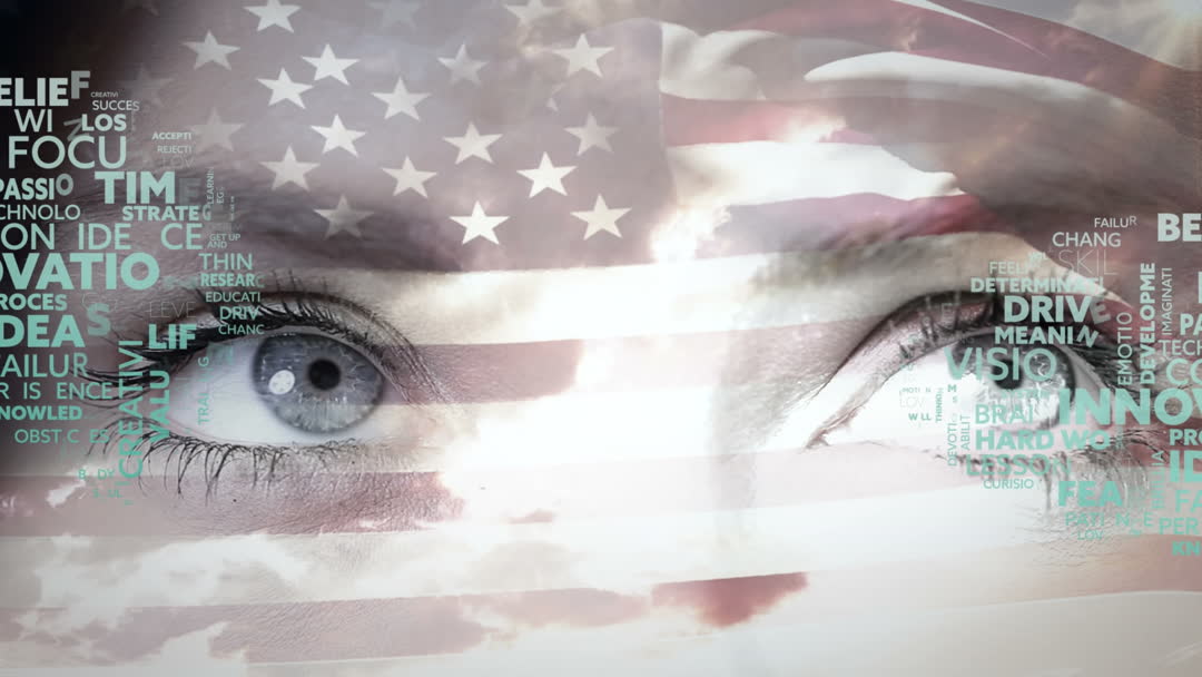 This creative illustration features a blend of technological keywords overlaid on an American flag and human eyes, symbolizing innovation and progress in the United States. Use this video for articles and presentations on technological advancement, national progress, or data-driven innovation.