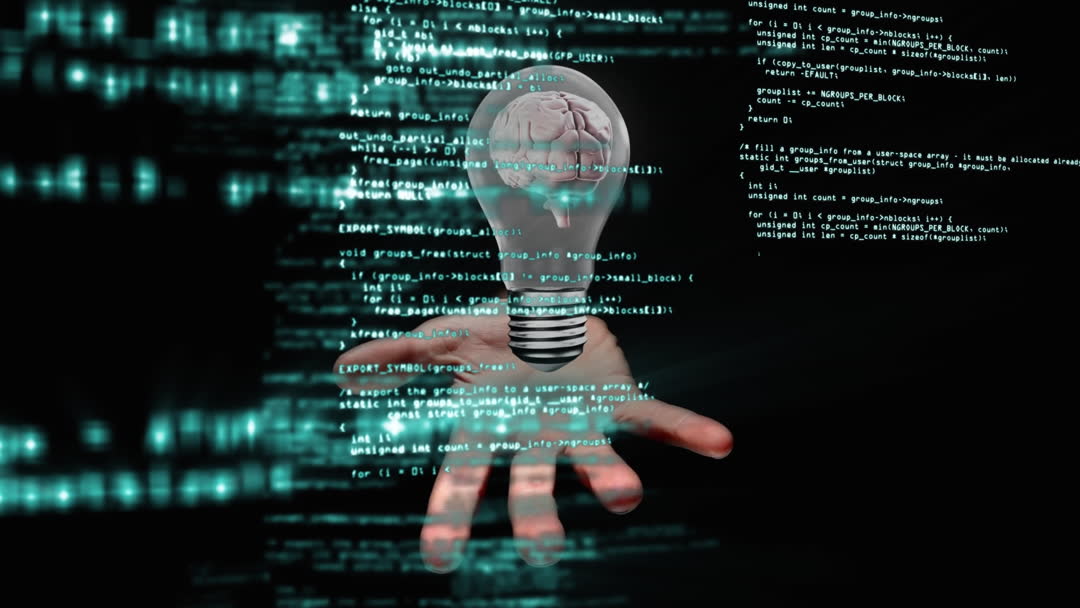 Concept of innovation and modern technology showing a light bulb floating above a hand with code overlay. Represents ideas, programming and futuristic technology thoughts. Useful for technology blogs, business innovation start-ups, and articles about creative processes in digital industries.