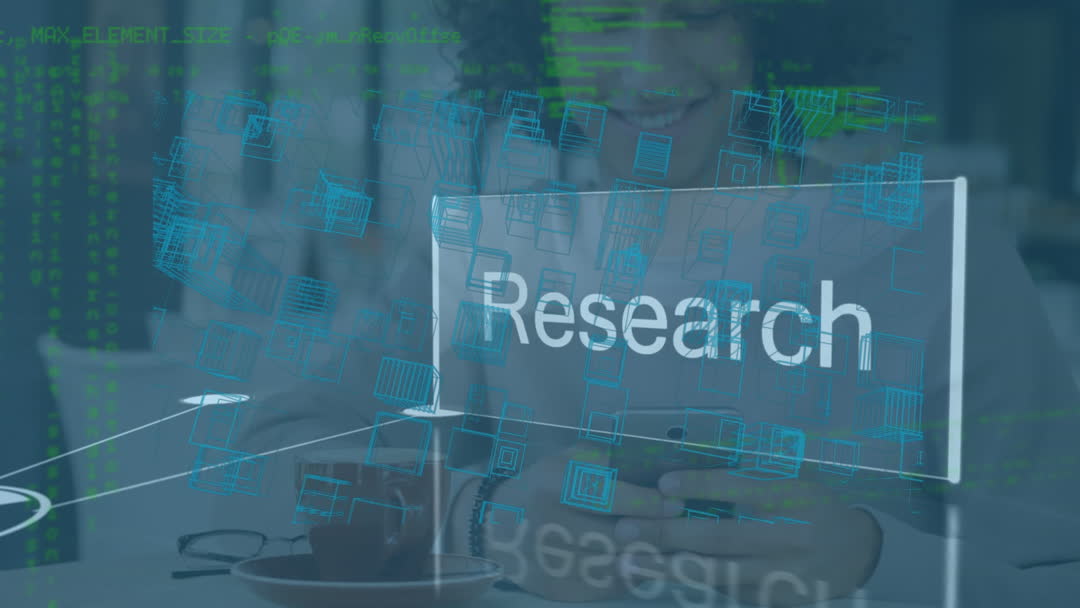 This stock photo captures a forward-looking concept with a biracial woman engaging with her smartphone, overlayed with symbolic data processing elements and the word 'Research'. Useful for representing tech reviews, scientific studies, or illustrating topics such as modern communication and technological advancements in marketing materials or educational resources. Appealing to those focused on themes of innovation, connectivity, and the future of digital interaction.