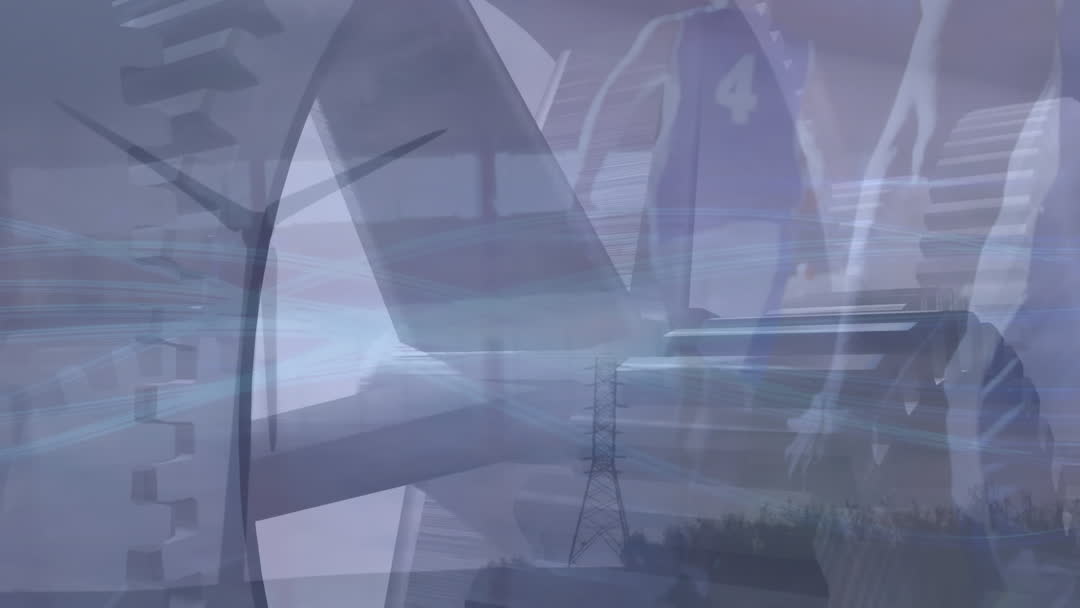 Illustrates fusion of sports with industrial and renewable elements, signifying progress and innovation. Useful for themes on technology integration, green energy impacts in sports, or global economic change. Visual concept of diverse collaborations across fields are highlighted.