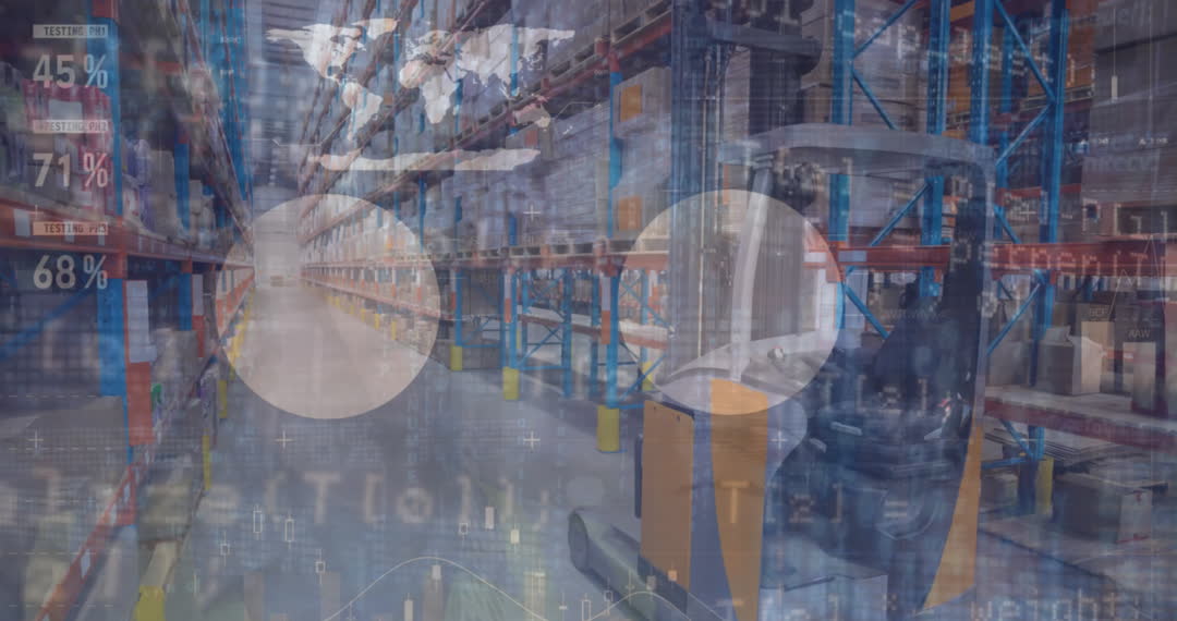 Visual depiction of business teamwork in a logistics warehouse setting with digital financial data overlays. Useful for illustrating themes of global trade, efficient inventory management, and successful collaboration in business presentations or trade industry articles.