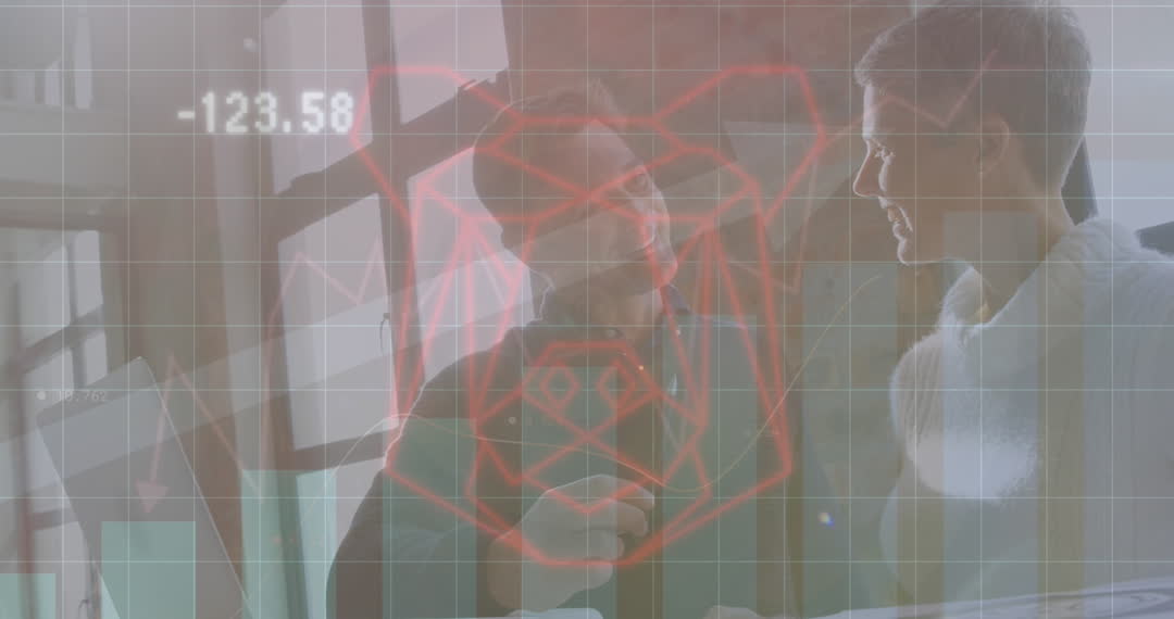 Caucasian coworkers actively discussing business strategies in a bright office environment. Overlay of financial graphs, numeric data, and abstract animal graphic signifies data analysis and teamwork. Suitable for illustrating concepts of modern office dynamics, strategic planning, teamwork, and innovative business solutions. Ideal for professional presentations, business blogs, and corporate marketing materials.