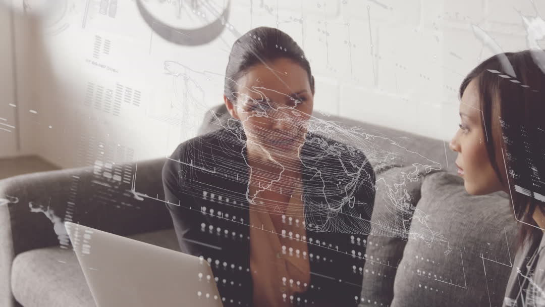 Two businesspeople engage in a strategy meeting with digital financial data superimposed over them, depicting global business concept. Ideal for illustrating teamwork, innovative solutions, strategy planning sessions, and modern business practices where technology meets entrepreneurship. Suitable for corporate presentations and financial strategy content.