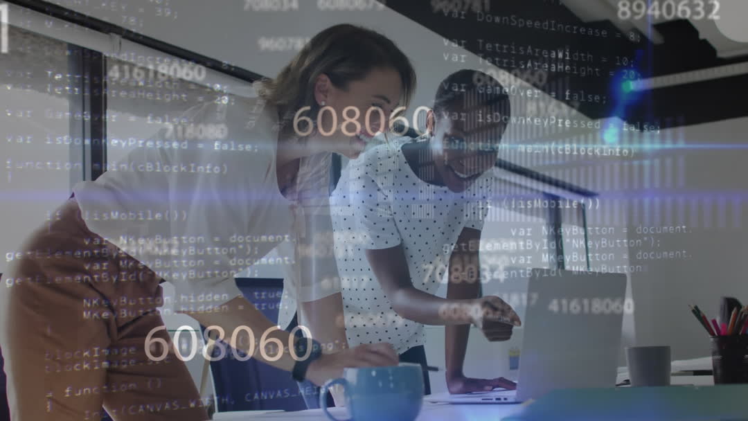 Diverse business professionals analyzing digital data projections in a modern office. This dynamic scene depicts collaborative efforts in technology and data. Perfect for representing innovation, teamwork, and modern business practices in presentations, marketing materials, or articles discussing digital transformations or collaborative work environments.