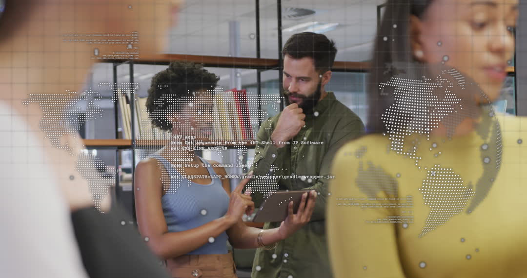 Group of business professionals discussing data-driven solutions with a digital map overlay in work setting. Great for concepts related to collaboration, modern technology integration, data analysis in business, or global strategies. Could be used in marketing materials for tech-savvy business services or consulting firms. Ideal for illustrating teamwork and innovative business practices in a digital era.