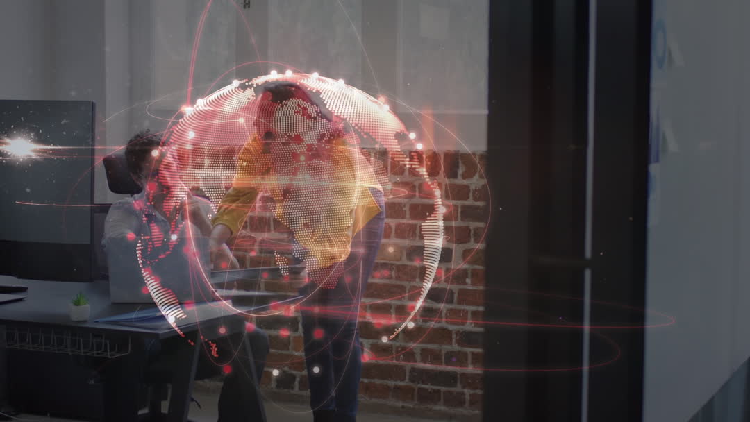 Two business professionals, appearing diverse, engage in discussing digital strategies with a globe and digital interface elements creatively overlaid. This videory gives a sense of global communication and technological advancements, ideal for representing modern business strategies, innovative digital solutions, and cross-cultural collaboration in presentations, marketing materials, and websites focused on future-driven enterprises.