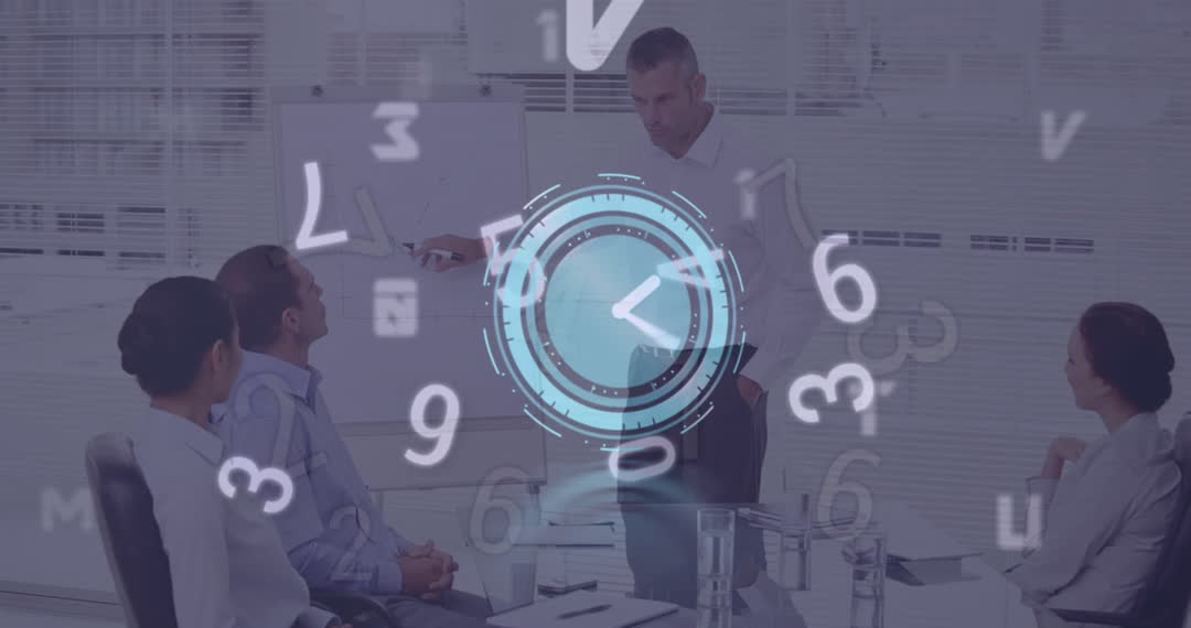 Group of business professionals in a meeting with animated clock and numbers overlay. Perfect for illustrating concepts of time management, technological advancements in business, digital transformation, and data analysis in corporate environments.