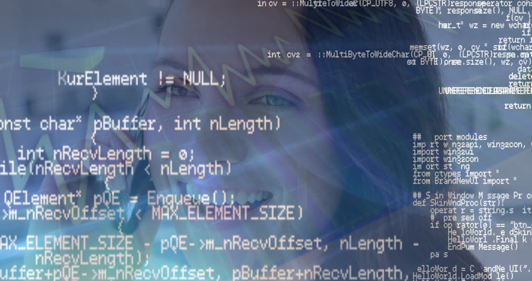 Depicts a caucasian businesswoman engaged in a discussion on a smartphone with digital code overlay, representing modern communication and the integration of technology in business. Ideal for illustrating concepts related to digital innovation, technological transformation, and global business interaction.