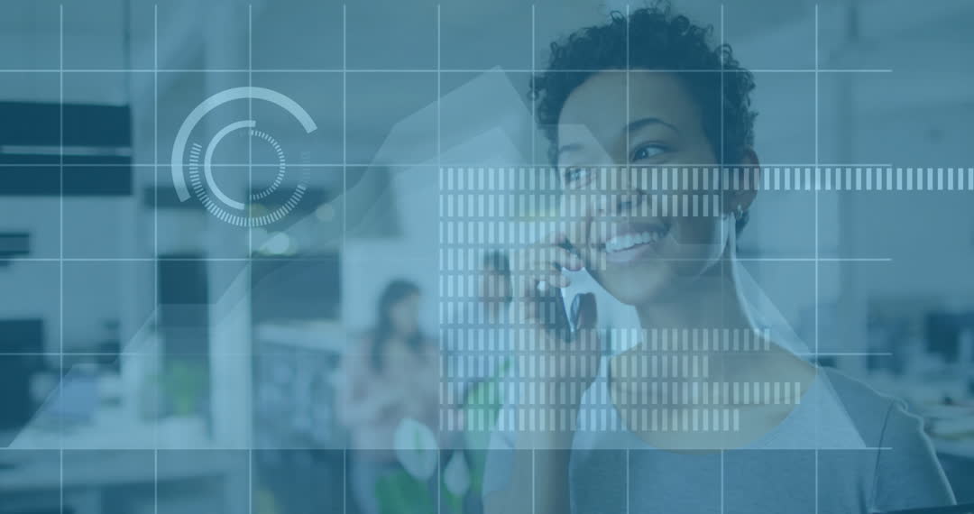 Woman engaging smartphone conversation amidst financial data processing visuals, emphasizing modern business and technology integration. Perfect for financial consultancy, tech innovation pieces, or communications in business marketing materials.
