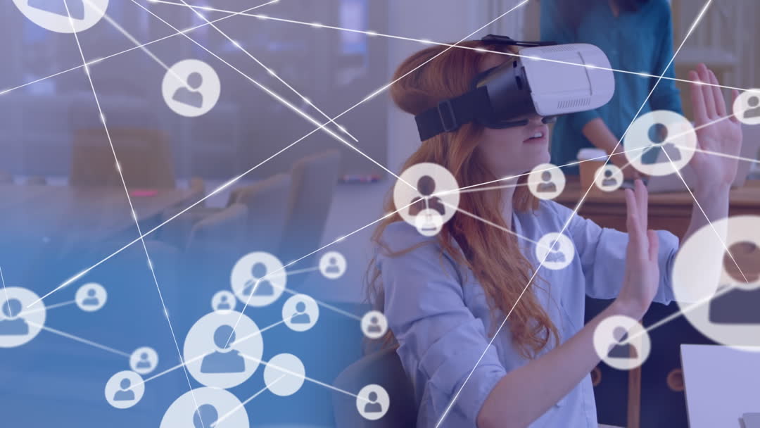 Businesswoman engaging with virtual reality technology, wearing VR headset, surrounded by animated digital connection network. Symbolic representation of future digital workspaces and innovative business practices. Useful for illustrating digital transformation, technological collaborations, and networking in professional settings.