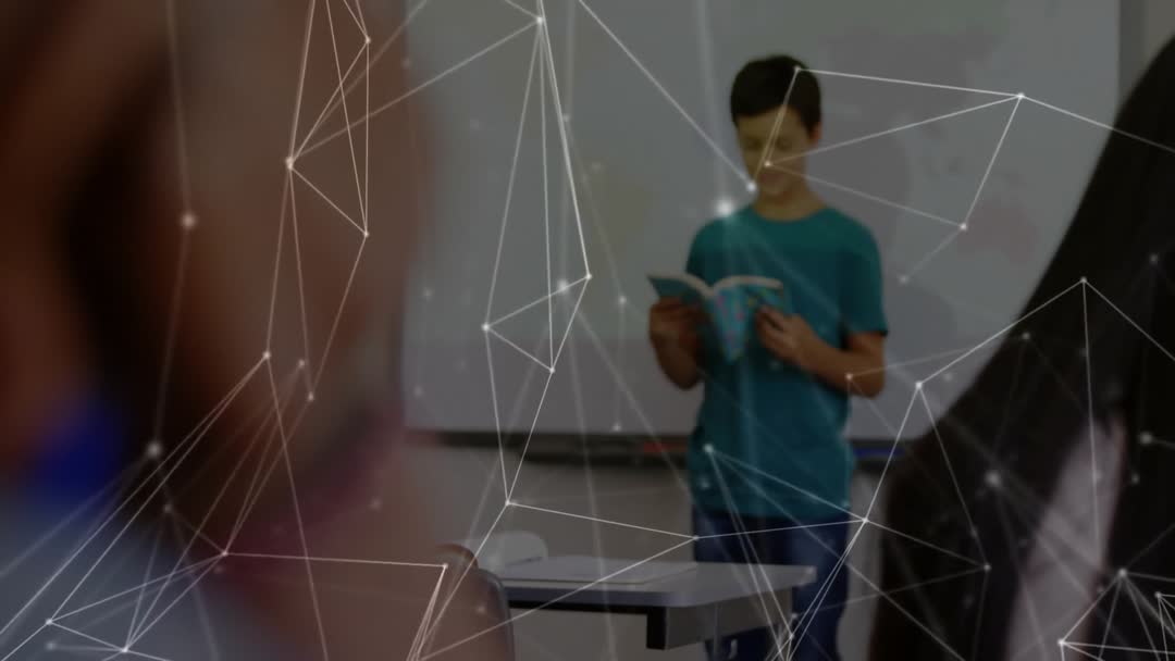 A student in a classroom is engaged in reading, while digital connectivity graphics represent techno-educational themes. This visual illustrates the integration of technology in modern educational environments, offering a vivid example of how digital learning and networking concepts blur traditional educational settings. Useful for content related to education technology, innovative teaching methods, and future classroom tools implementations.