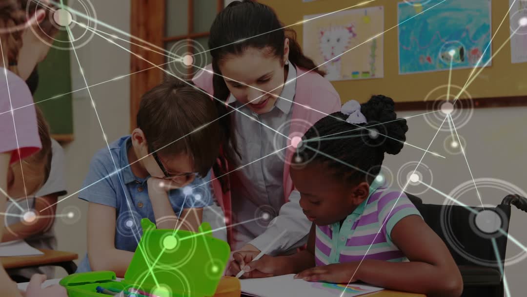 Classroom setting showcasing female teacher mentoring diverse students in learning activities interconnected through animated educational network nodes, representing the blend of technology and traditional teaching. Perfect for concepts in modern education, e-learning, and collaborative growth, demonstrating inclusivity and inventive teaching methods.