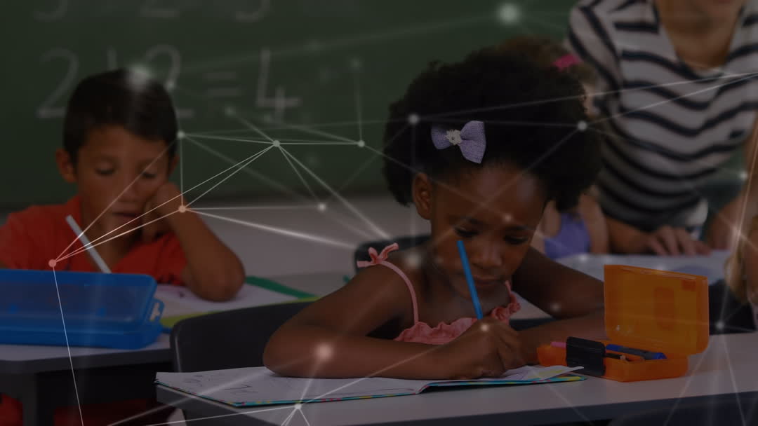 Children engaged in learning activities in a classroom setting with a digital network overlay symbolizes the integration of technology in education. This visual is ideal for illustrating concepts of modern, technology-enhanced learning environments, promoting educational tech tools, or representing the fusion of traditional learning with digital innovation.
