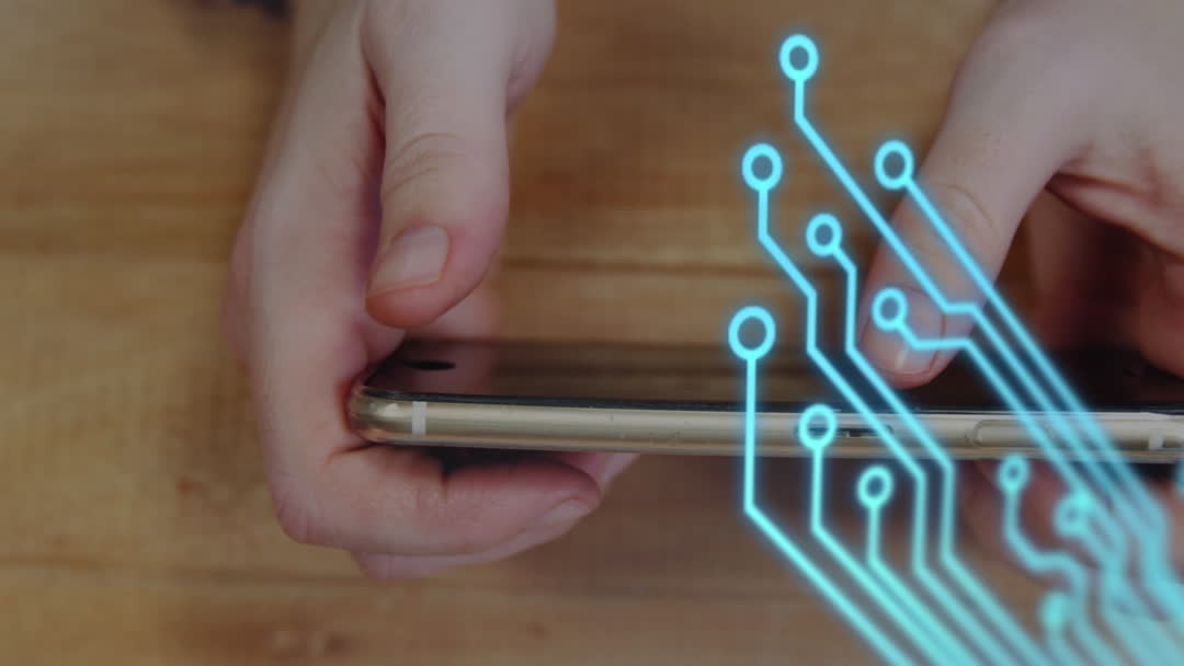 Animation illustrating concept of modern technology and global networking with smartphone use. Digital circuit elements overlay hand holding smartphone, representing connectivity and technological communication. Useful for promotional content in technology, innovation sectors, and advertisements emphasizing connectivity.