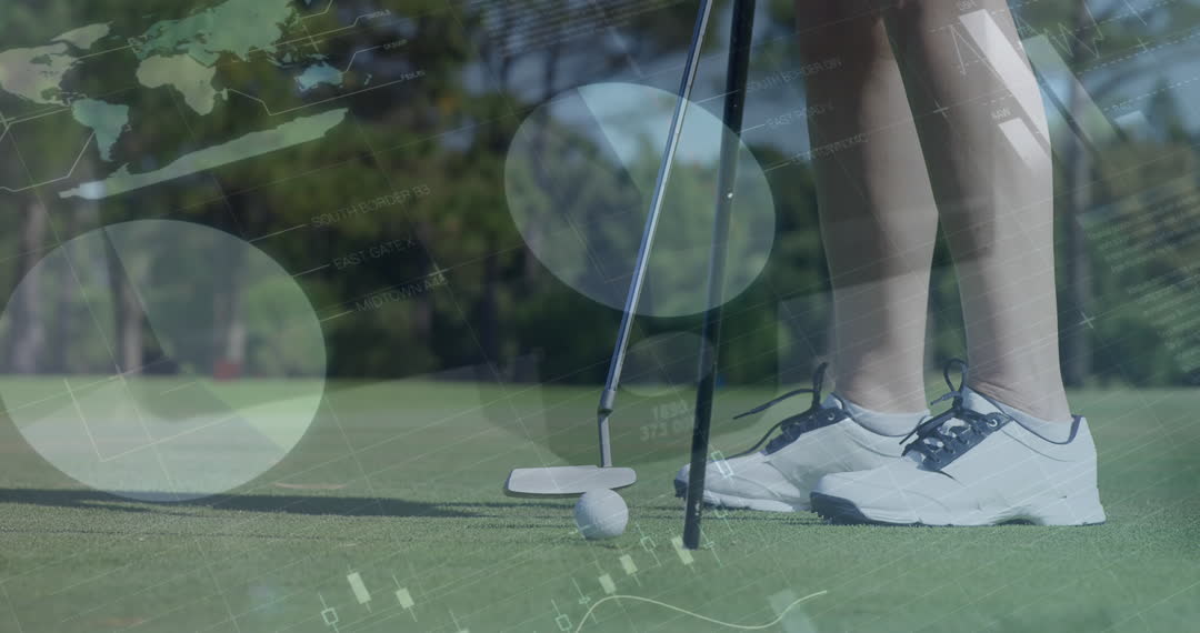 Visualization showcases the intersection of modern data analytics and traditional golf. Female golfer's legs poised with golf club and ball alongside digital graphs implies technological enhancement in sports. Useful for content discussing advancements in sports analytics, women's sports technology, and improving golfing techniques with data insights.