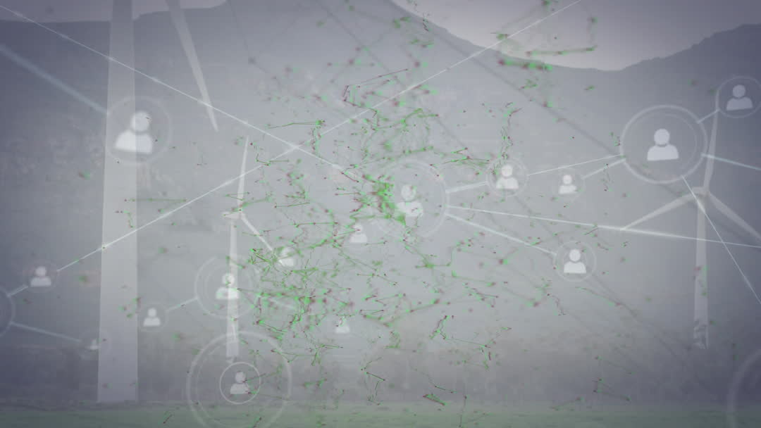 An animation illustrating global digital connections through an abstract network. Green lines represent data streams weaving across user icons symbolizing a social network. Wind turbines set a cutting-edge, sustainable technology theme. Useful for technology presentations, educational materials, and concepts emphasizing interconnectedness.