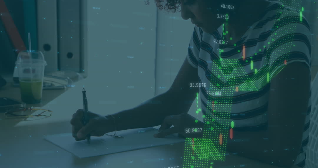 Scene blending data visualizations with workspace depicting cutting-edge technology integration with financial analytics on green graphs climbing, highlighting real-time data processing for business assessments or educational presentations exploring innovative contexts of digital trends.
