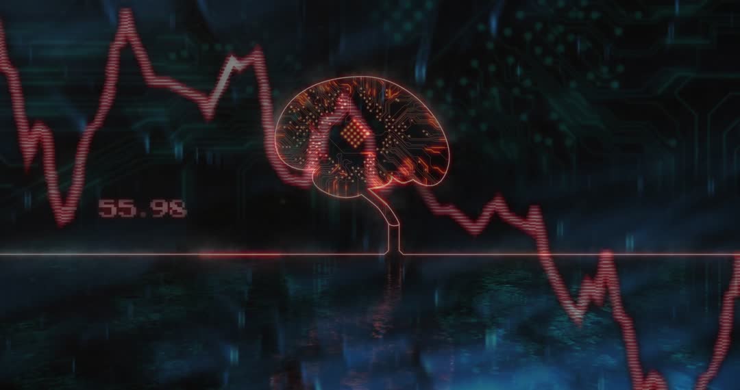 Visualization showcases an animated glowing brain with dynamic and fluctuating data graph set against a dark digital background. Ideal for themes surrounding artificial intelligence, cybersecurity, and tech innovation. Could be used in presentations related to future technology, cybersecurity campaigns, and digital data analysis.