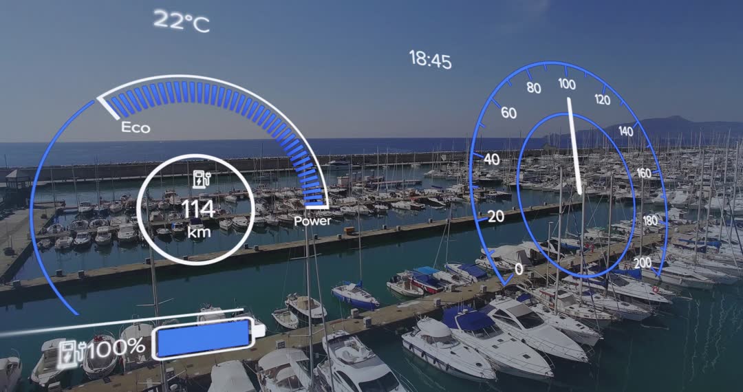 Digital dashboard overlay superimposing speed and battery indicators over a marina filled with boats. The concept of modern technology and innovation in marine navigation is highlighted. Ideal for use in articles or presentations on advancements in maritime technology, GPS systems, and eco-friendly boating solutions.