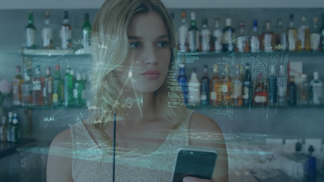 Innovative Digital Financial Data Overlay on Interested Woman with Smartphone Video
